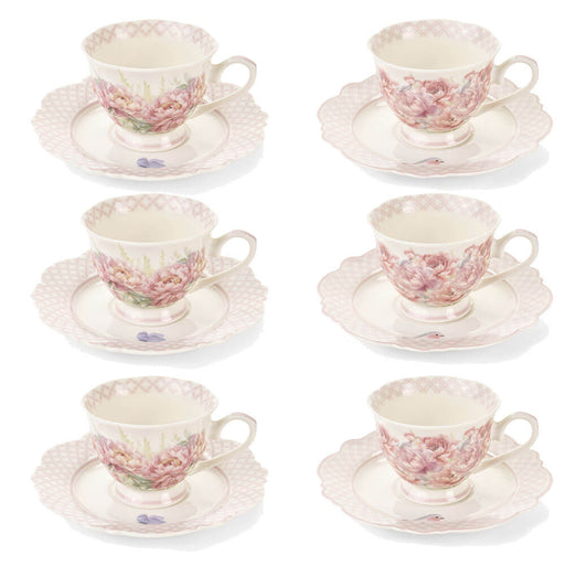 Set da 6 tazzine da caffè con piattino in porcellana/ceramica fine (finitura lucida), collezione Fiorirà. Il set alterna 2 fantasie coordinate: una...