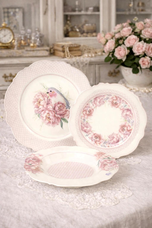 Servizio di piatti in porcellana Nuvole di Stoffa Fiorirà per sei persone , nei romantici toni del rosa antico. Presenta bordi smerlati con motivo...