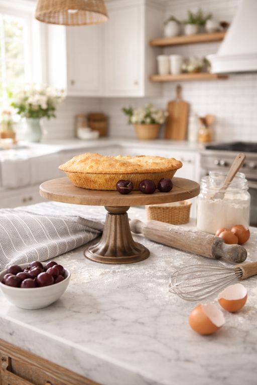 Elegante alzata per dolci realizzata con piano in legno naturale e base in ferro, perfetta per presentare torte, crostate, dessert o preparazioni s...