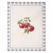 Canovaccio decorativo in cotone misto con stampa botanica di pomodori e cornice a quadretti azzurri, stile country chic.