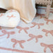 Tappeto rettangolare in 100% cotone con raffinato pattern a fiocchi rosa in rilievo, bordo decorato e base chiara. Perfetto per ambienti romantici.