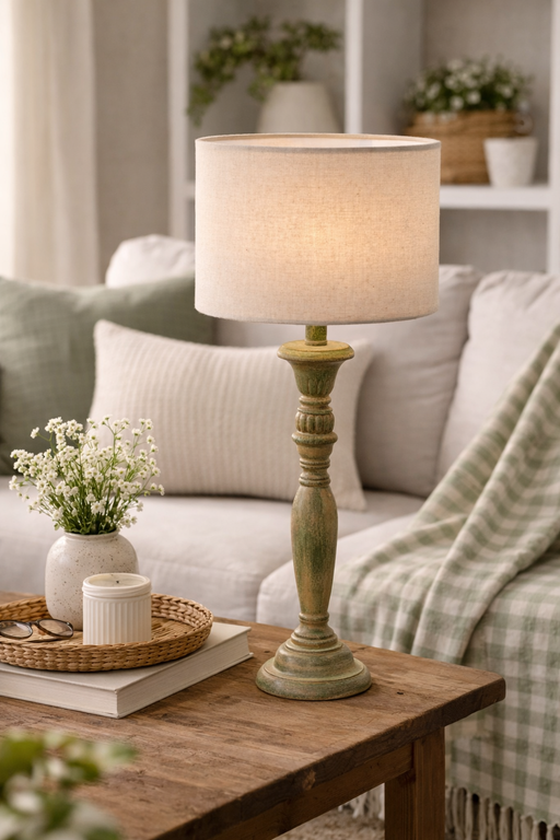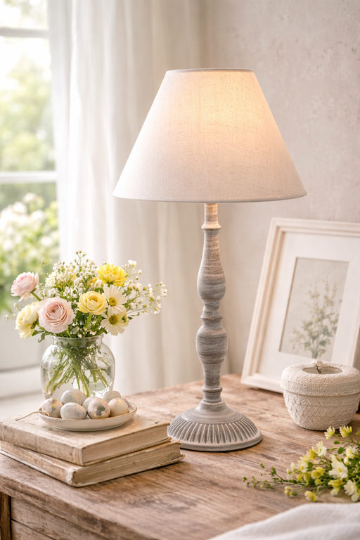 Lampada da Tavolo Flower Garden Nuvole di Stoffa Colore: tortora anticatoMateriale: legno, tessutoMisure: Base ø 11×46 cm – Cappetta ø 24×17 cm