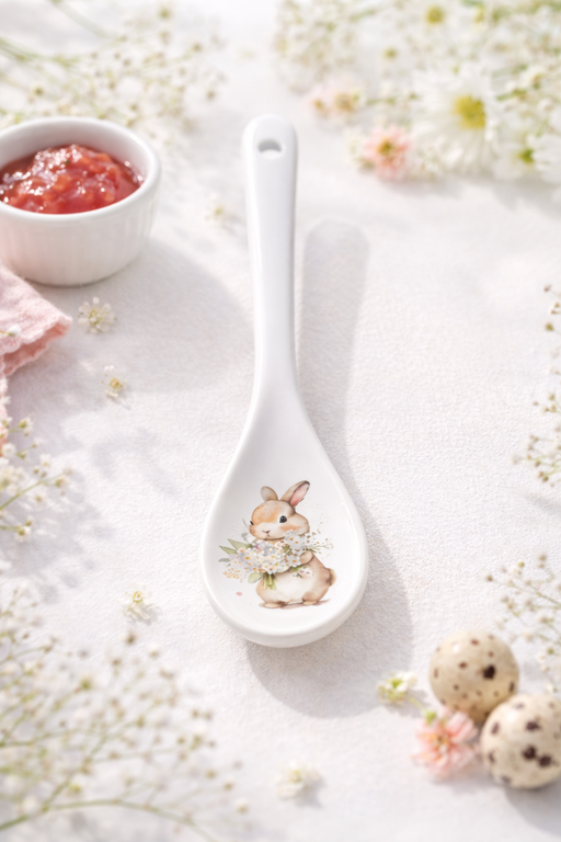 Grazioso cucchiaio in porcellana con motivo a coniglietti primaverili. Dimensioni: 13 cm Materiale: porcellana