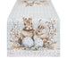 Runner in cotone Nuvole di Stoffa della collezione Pepen. La stampa raffigurante due coniglietti pasquali accostati, circondati da uova decorate, rami e piccoli fiori, su fondo a quadretti verde salvia con fascia floreale inferiore. Stile shabby chic delicato ed elegante.