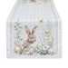 Runner in cotone Nuvole di Stoffa della collezione Pepen. La stampa raffigurante due coniglietti pasquali accostati, circondati da uova decorate, rami e piccoli fiori, su fondo a quadretti verde salvia con fascia floreale inferiore. Stile shabby chic delicato ed elegante.
