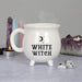 Questa tazza bianca brillante è progettata per assomigliare a un calderone e riporta la scritta "Strega Bianca". La tazza verrà consegnata in una scatola di cartone coordinata