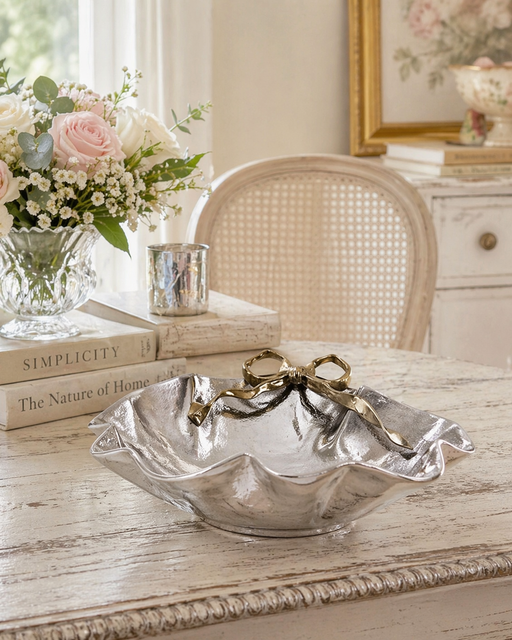 View full detailsRaffinato, luminoso e dal fascino delicato, questo splendido centrotavola con fiocco della collezione Clementina firmata Blanc Mariclò è l’accessor...