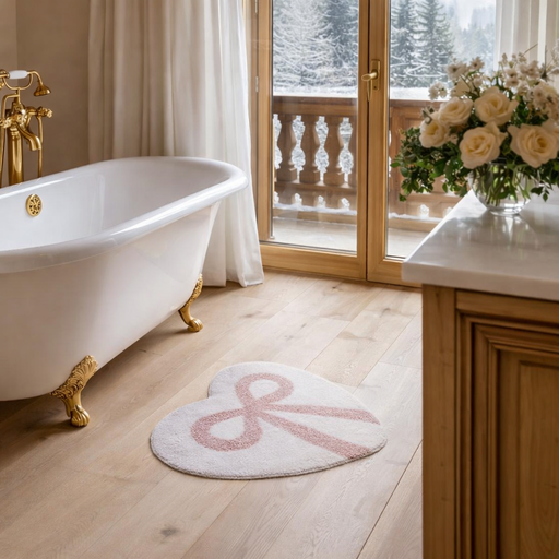Afficher tous les détailsTappeto a forma di cuore con un delicato fiocco rosa, 50×50 cm, della linea Blanc Mariclò. Morbido e accogliente, è perfetto come tappetino da bagn...