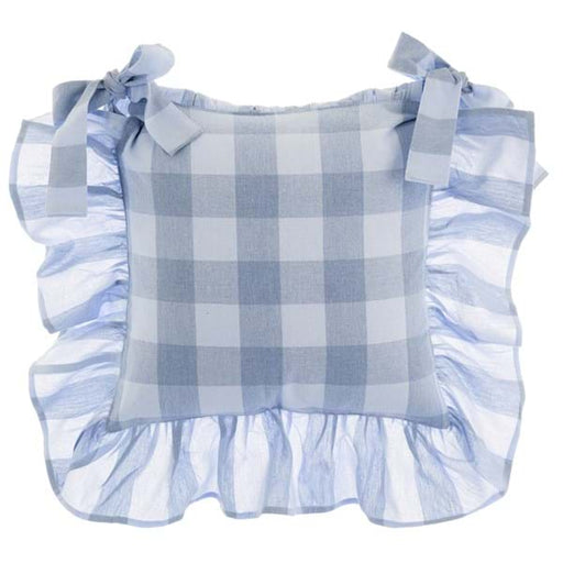 Afficher tous les détailsCopricuscino decorativo 40x40 cm in cotone e fibra sintetica, colore azzurro a quadri, impreziosito da volant perimetrale e fiocchi decorativi.Appa...