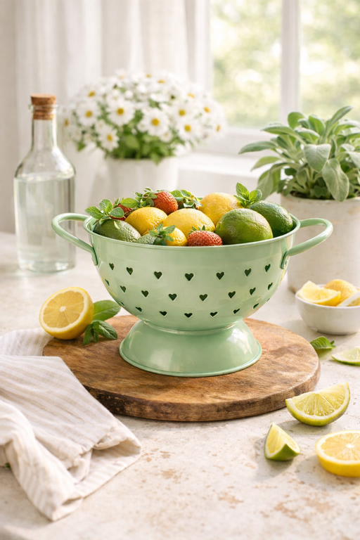 Scolapasta salvia decorato con graziosi cuoricini per scolare facilmente. Questo scolapasta può essere utilizzato anche come cestino per il pane o...