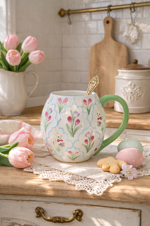Afficher tous les détailsRendi speciale la tua colazione con questa deliziosa tazza pasquale in dolomite da 13 cm, decorata con tulipani e dolci coniglietti in perfetto sti...