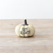 Un'affascinante decorazione a forma di zucca bianca decorata con la frase "Happy Halloween" elegantemente incisa in testo nero.