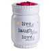 Questa elegante lampada profumata è un ottimo modo per aggiungere un profumo accogliente alla tua casa. Ha un bordo curvo e il messaggio «Live, Laugh, Love», che assicura che ci si possa concentrare sulle cose importanti della vita.